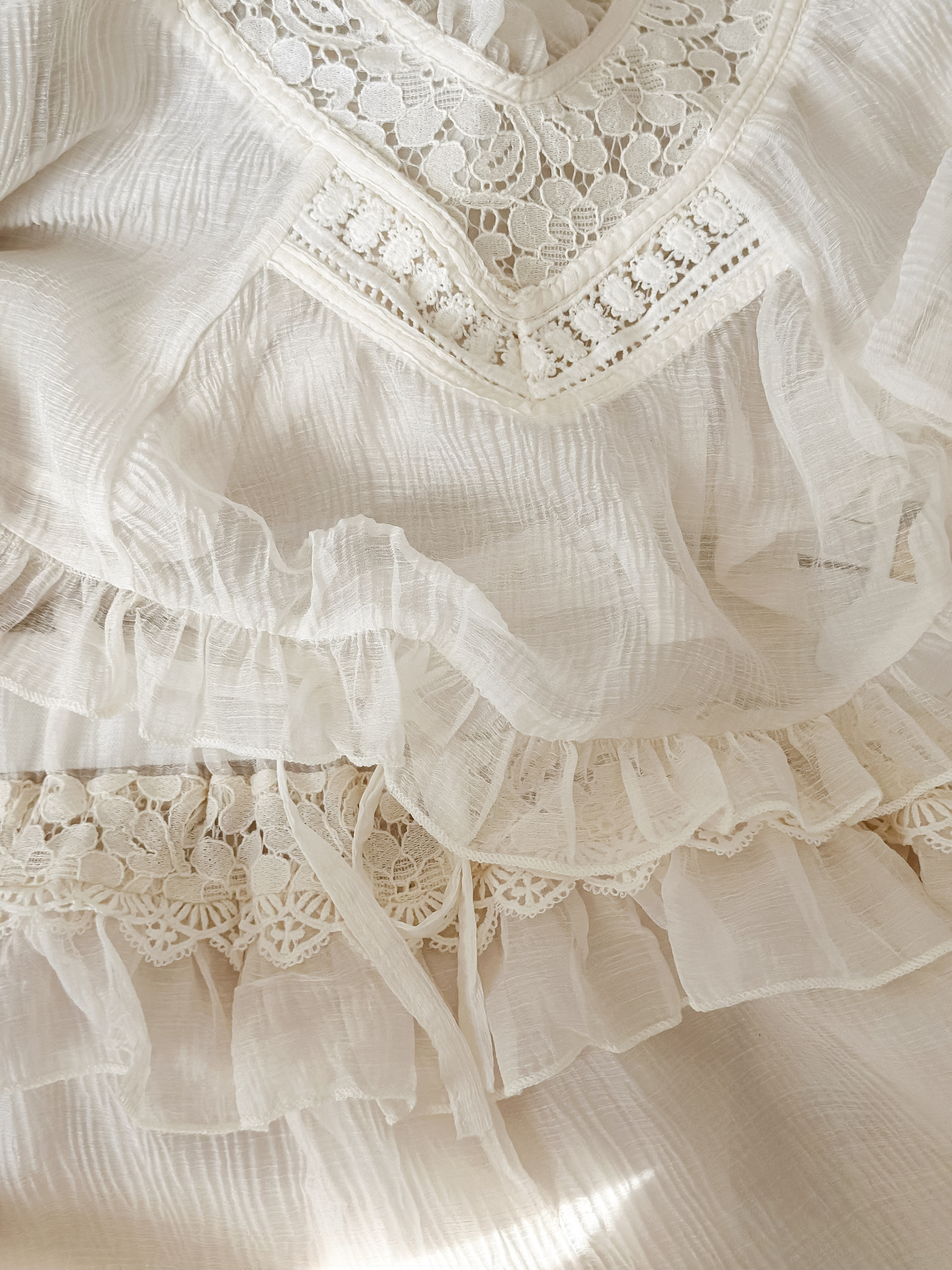 Romantyczny komplet wykończony falbankami, koronkami i haftami.