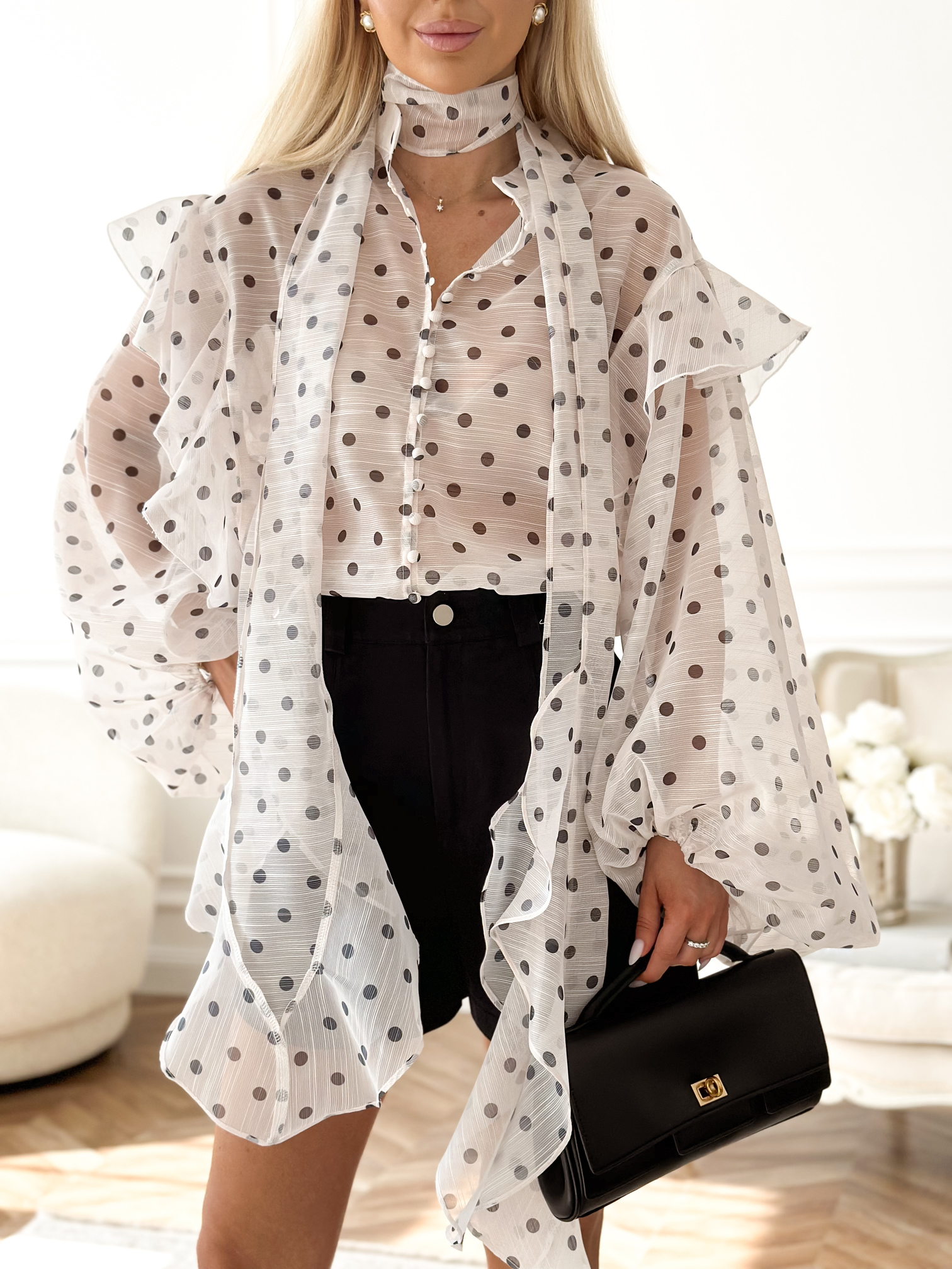 Klasyczny print w czarne groszki na kremowym tle.