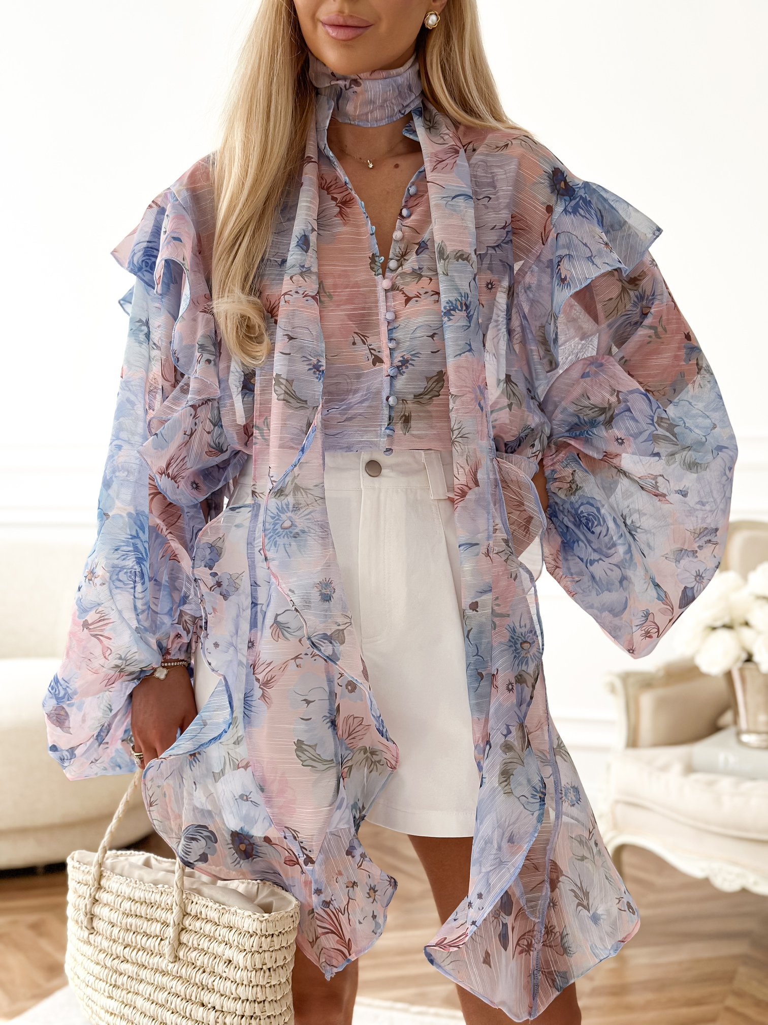 Długie, falbaniaste szarfy wokół szyi - można je zawiązać w efektowną kokardę.