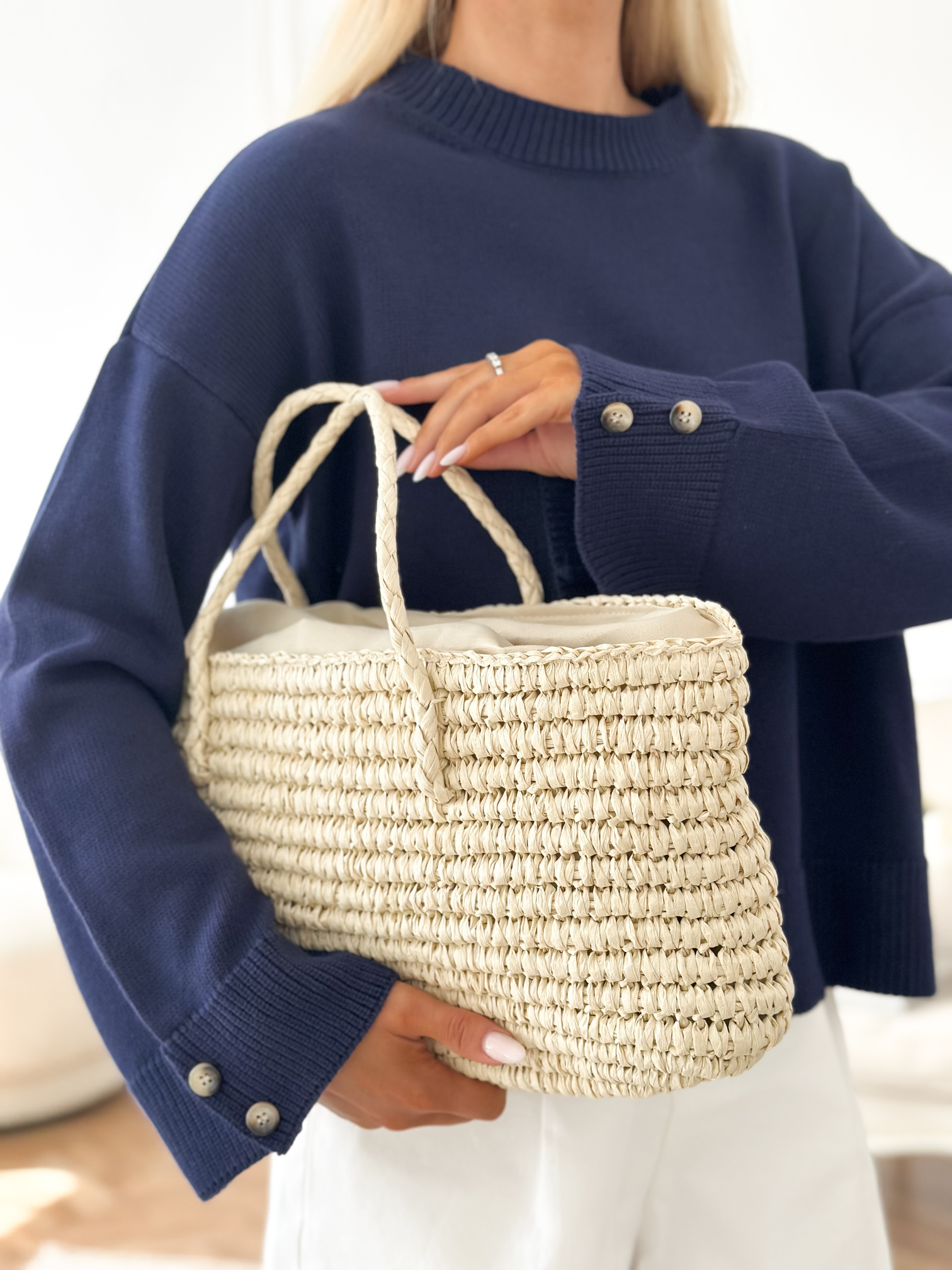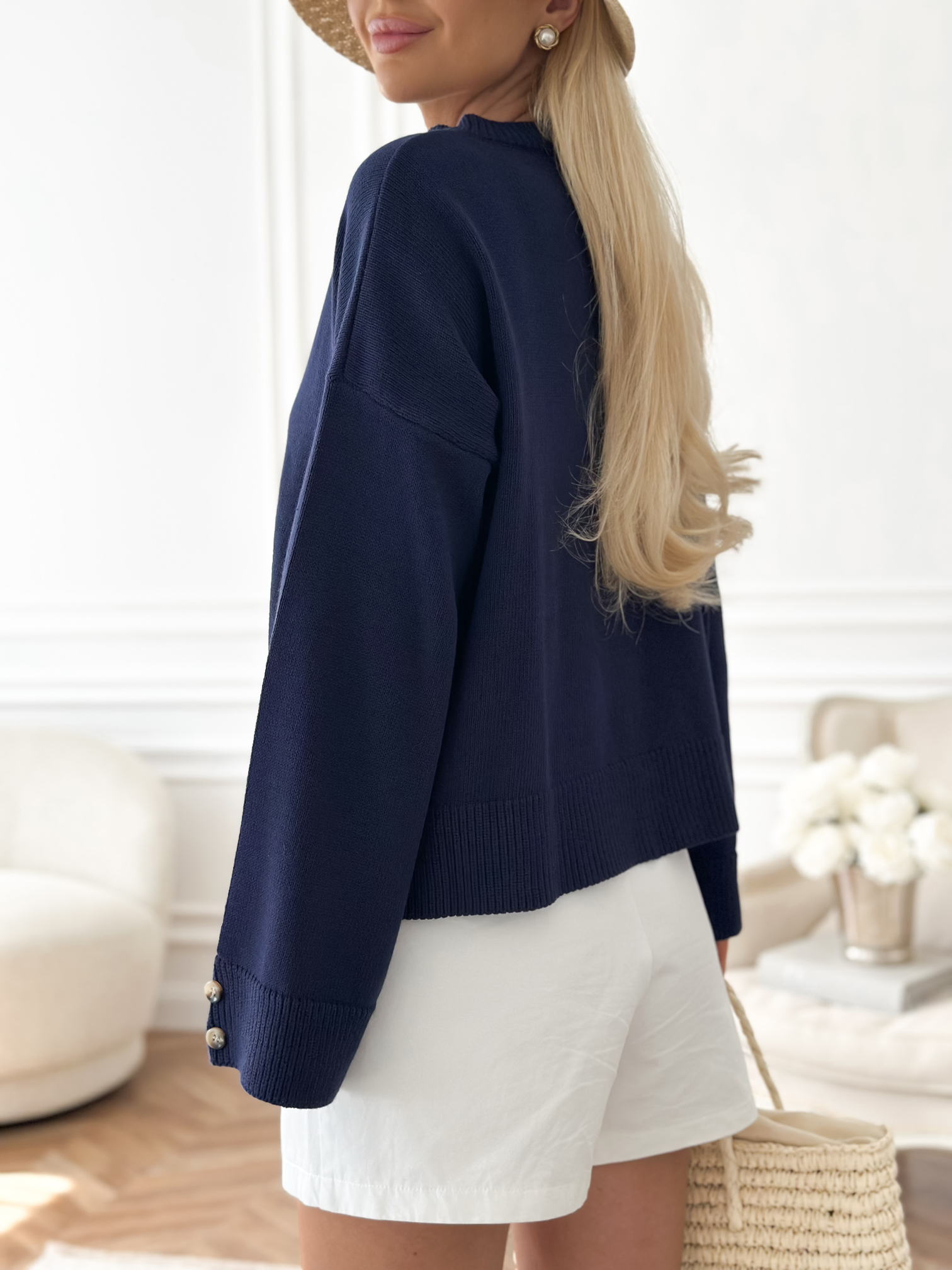 Sweter o pudełkowym fasonie.