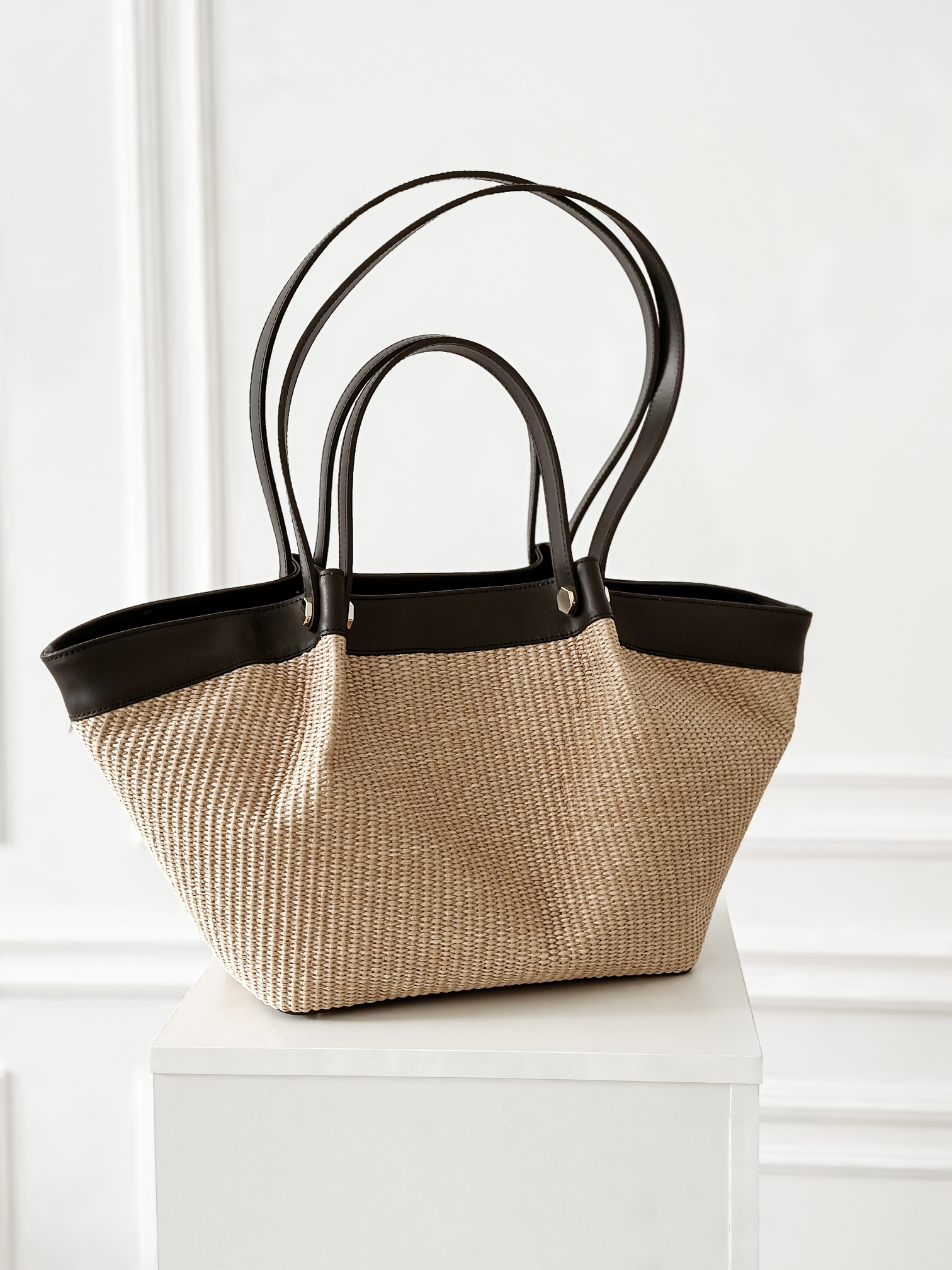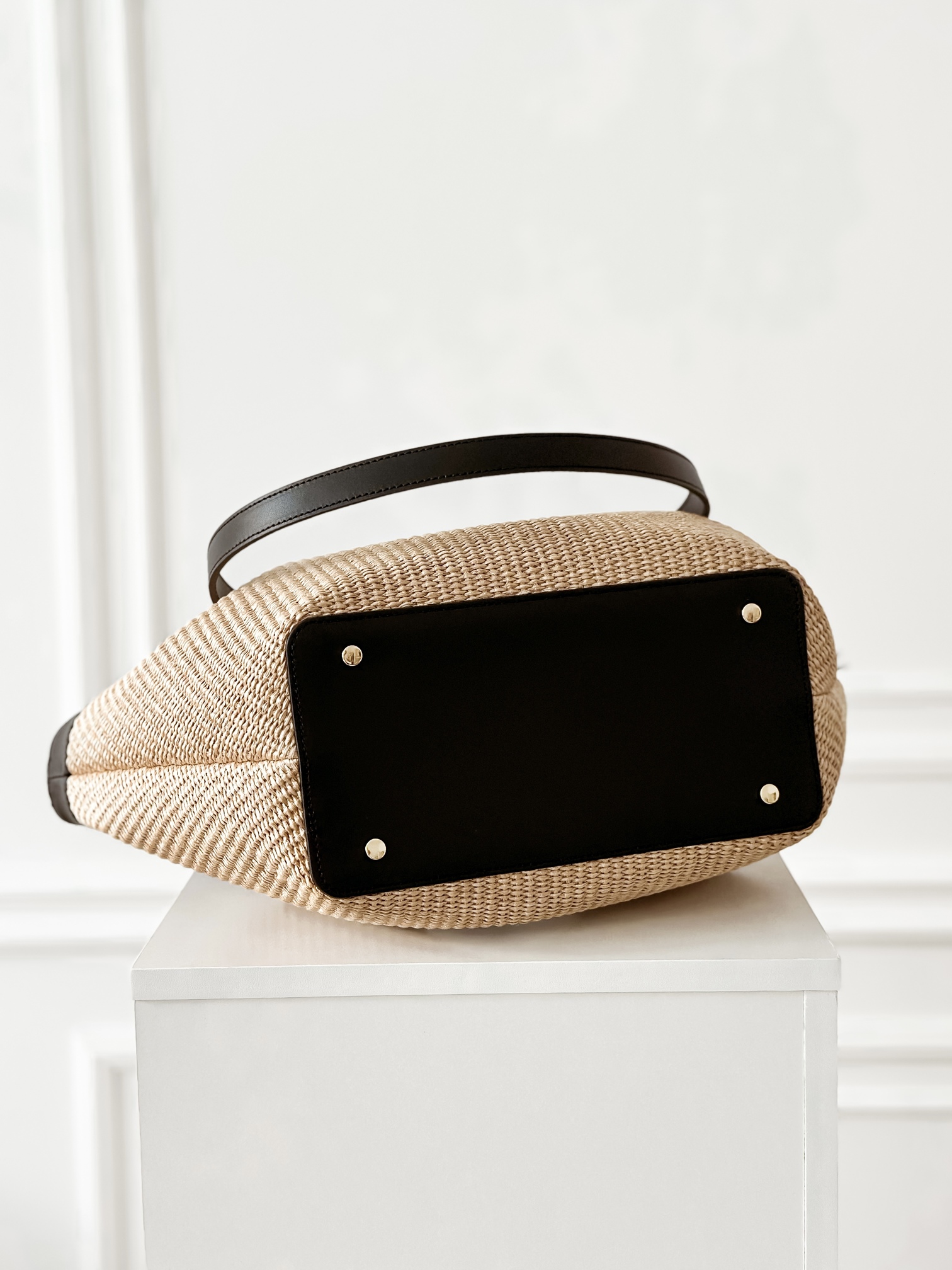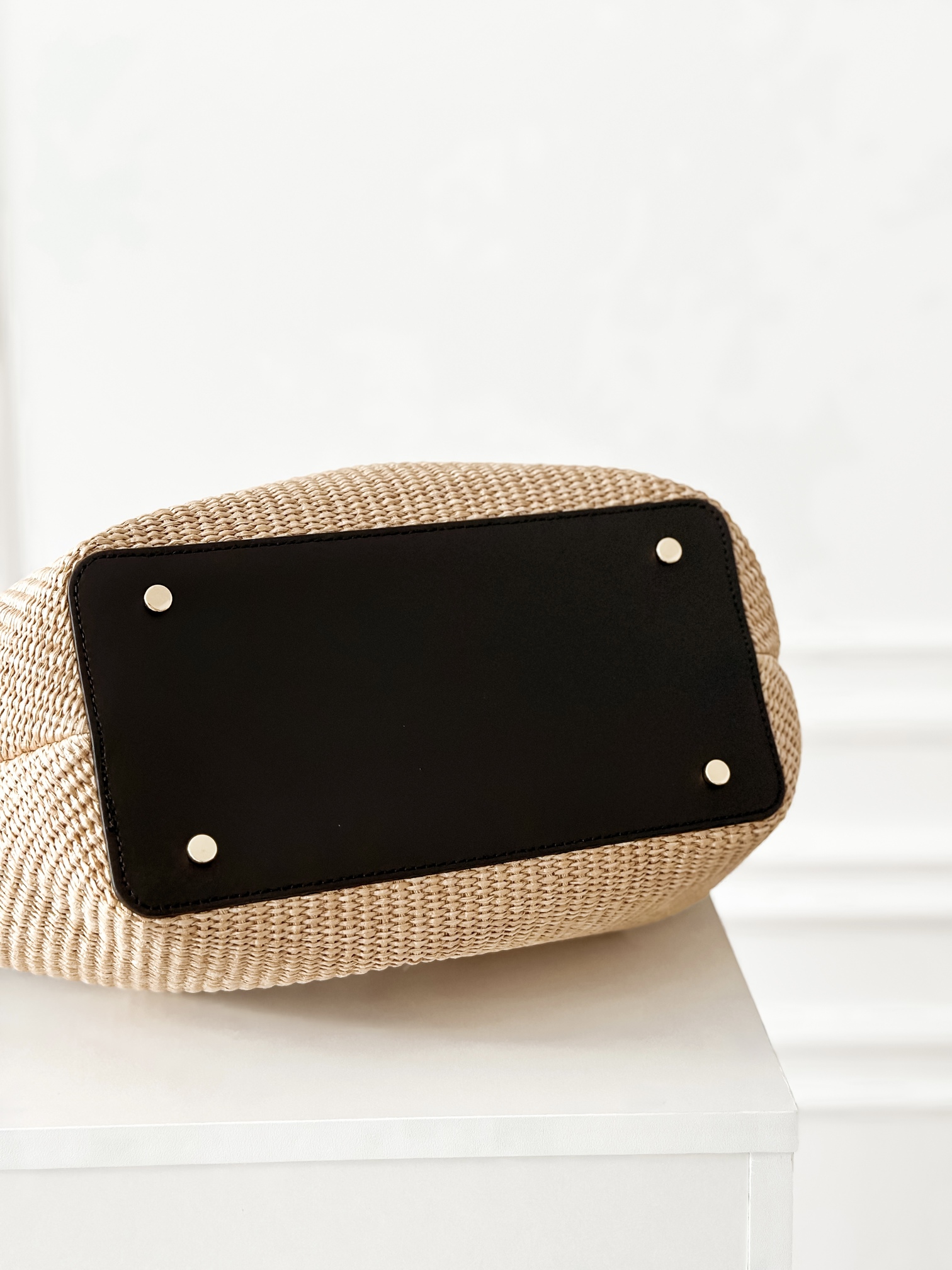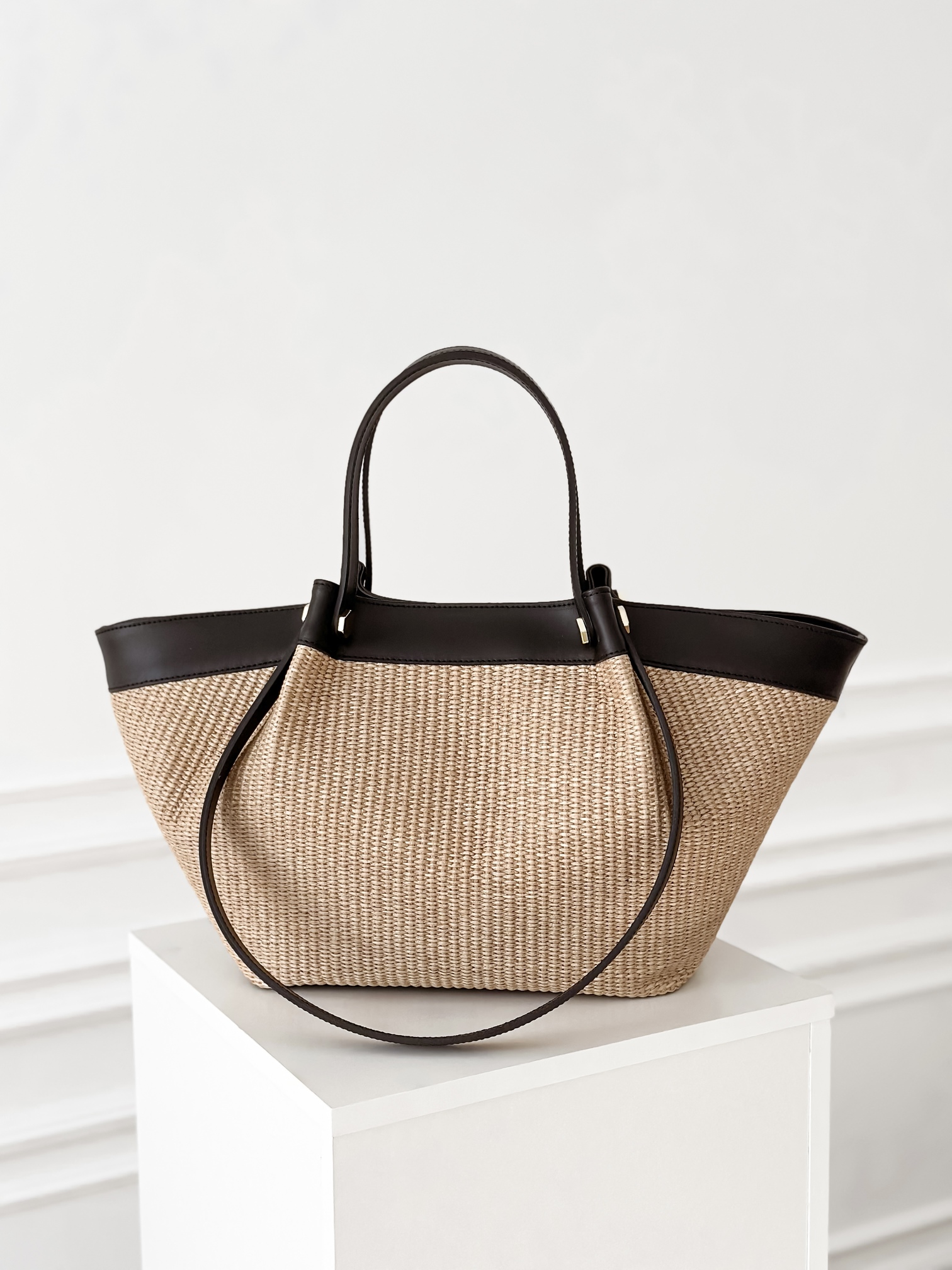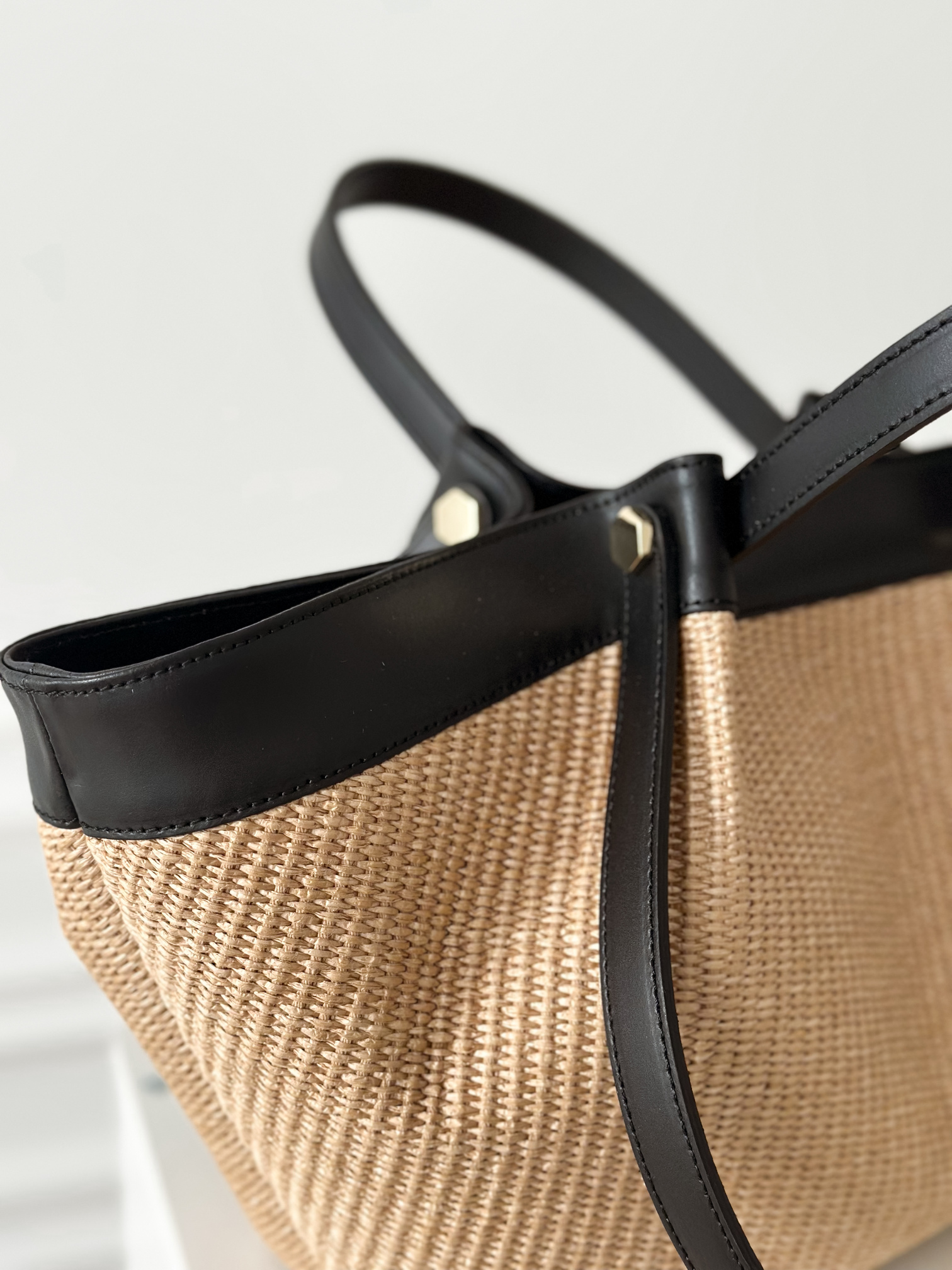 Duża, usztywniana torba wykonana z połączenia skóry naturalnej i raffii.
