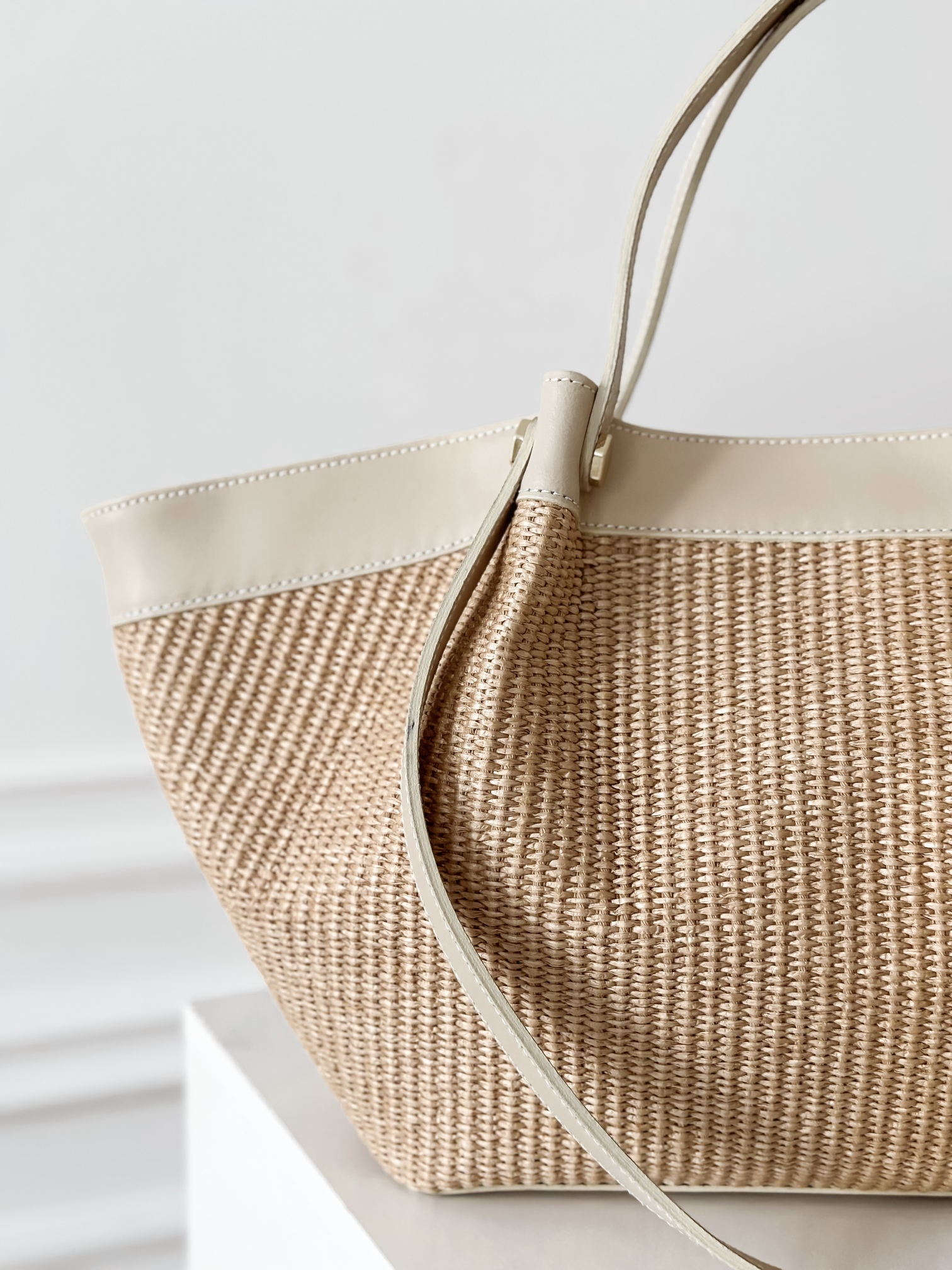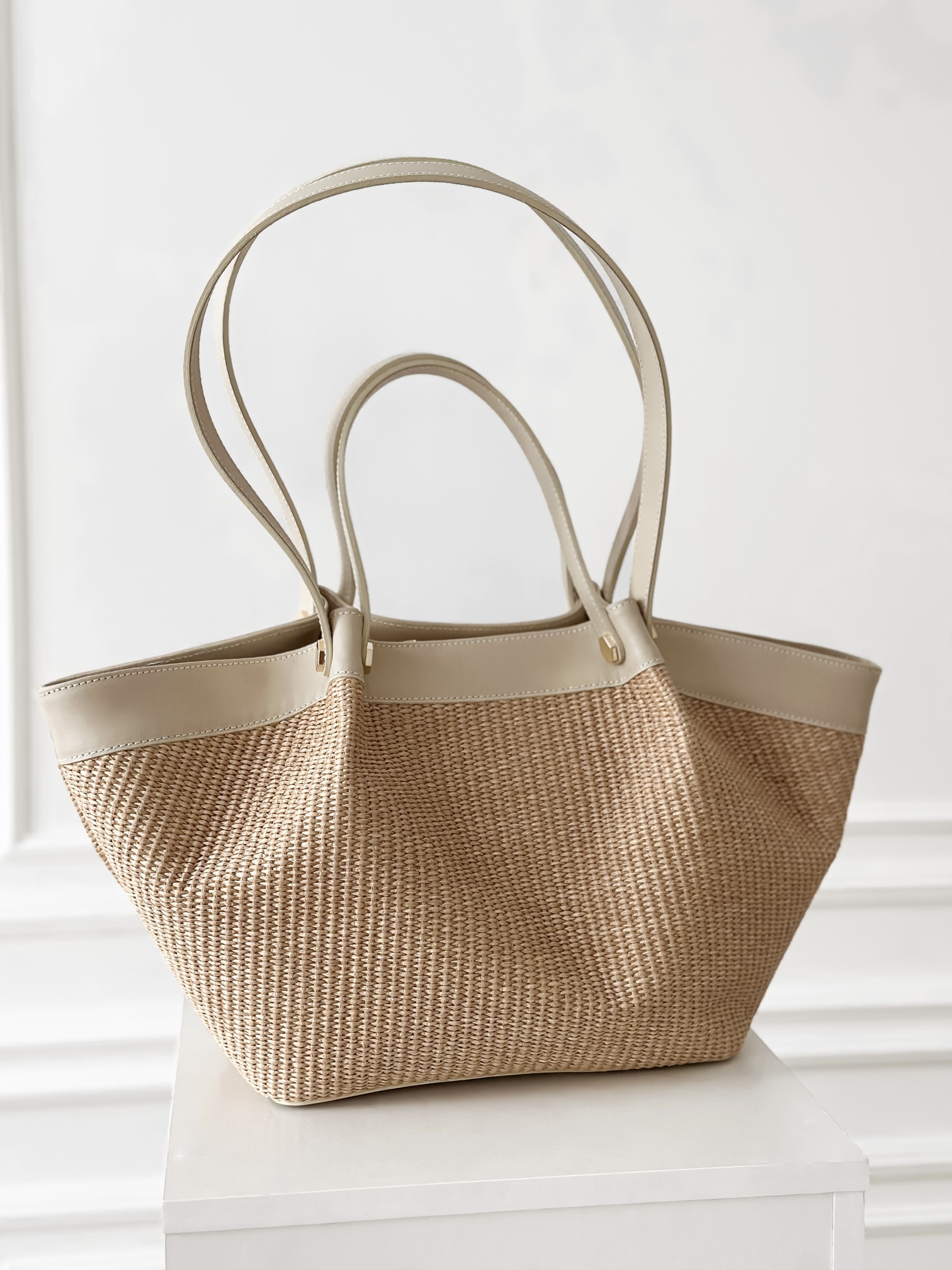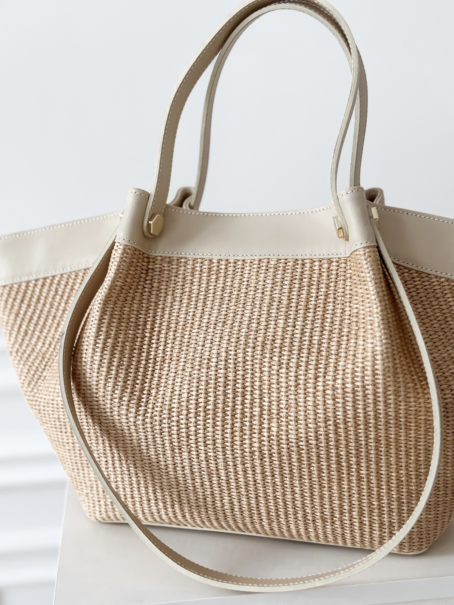 Duża, usztywniana torba wykonana z połączenia skóry naturalnej i raffii.