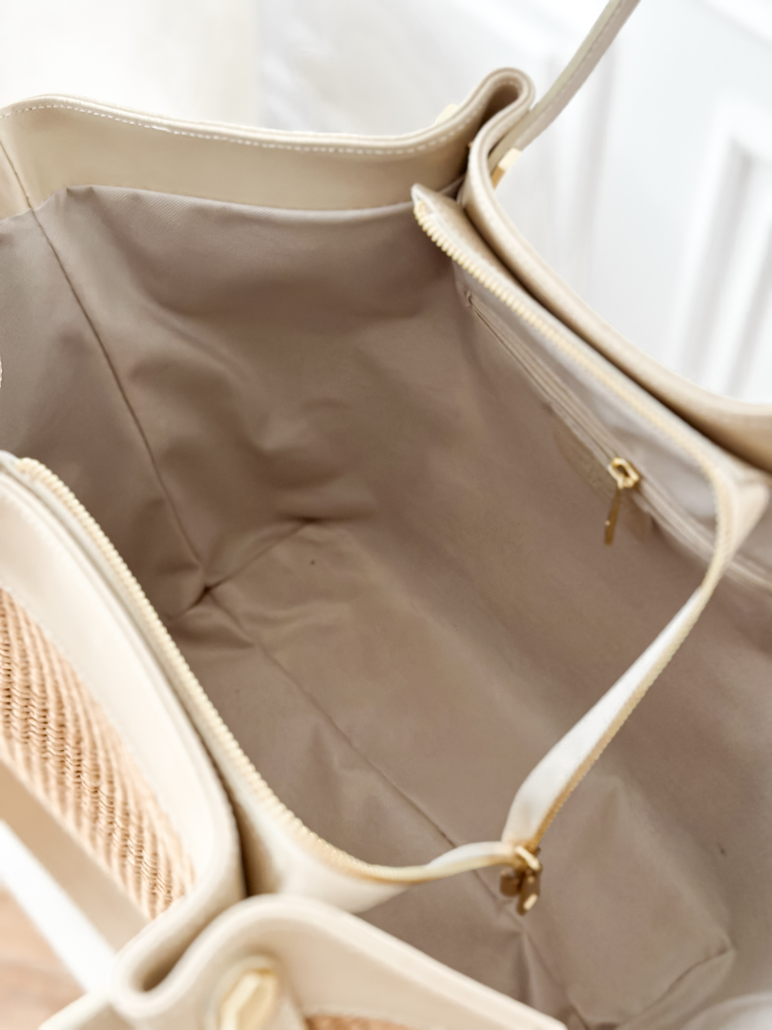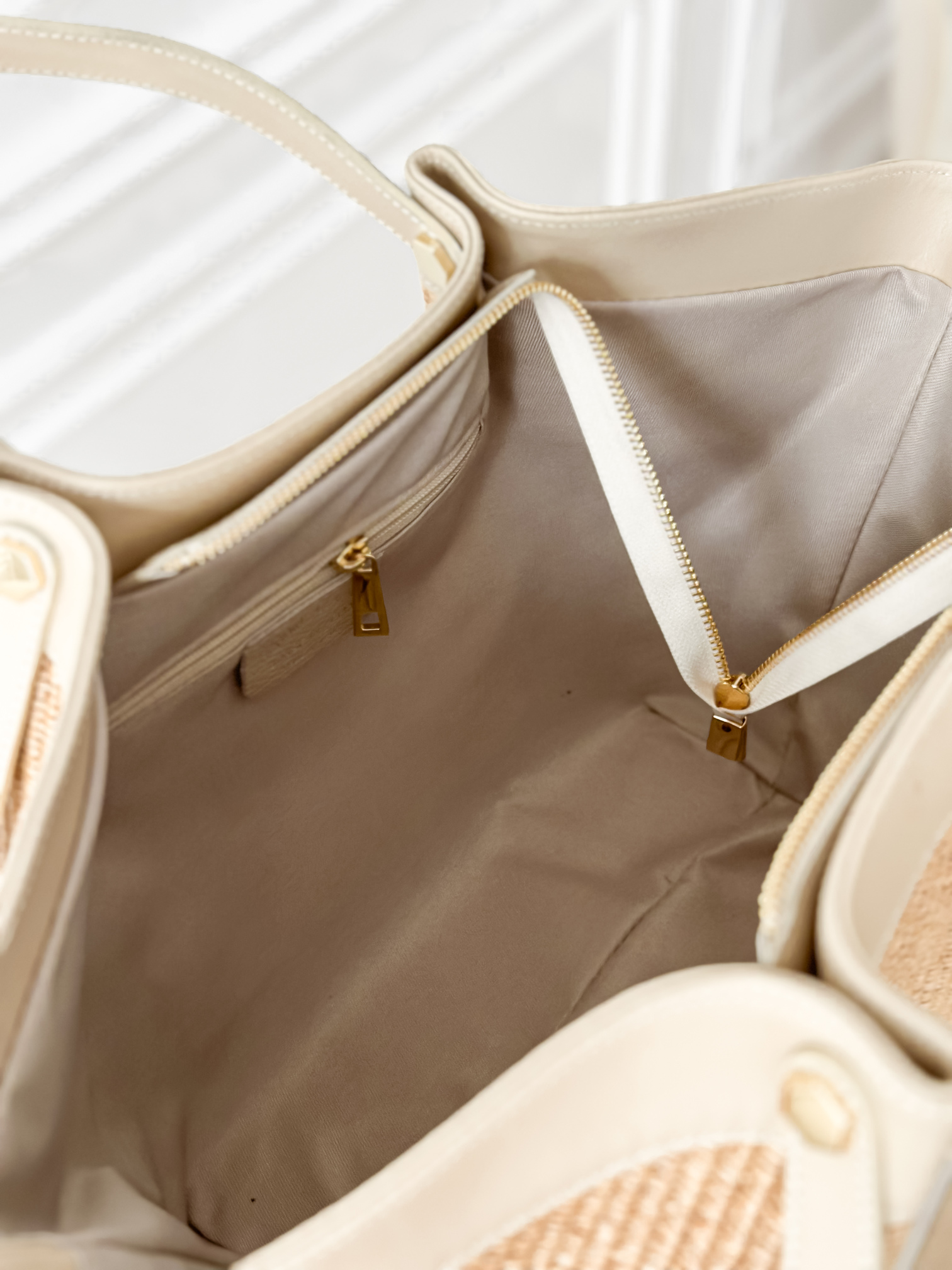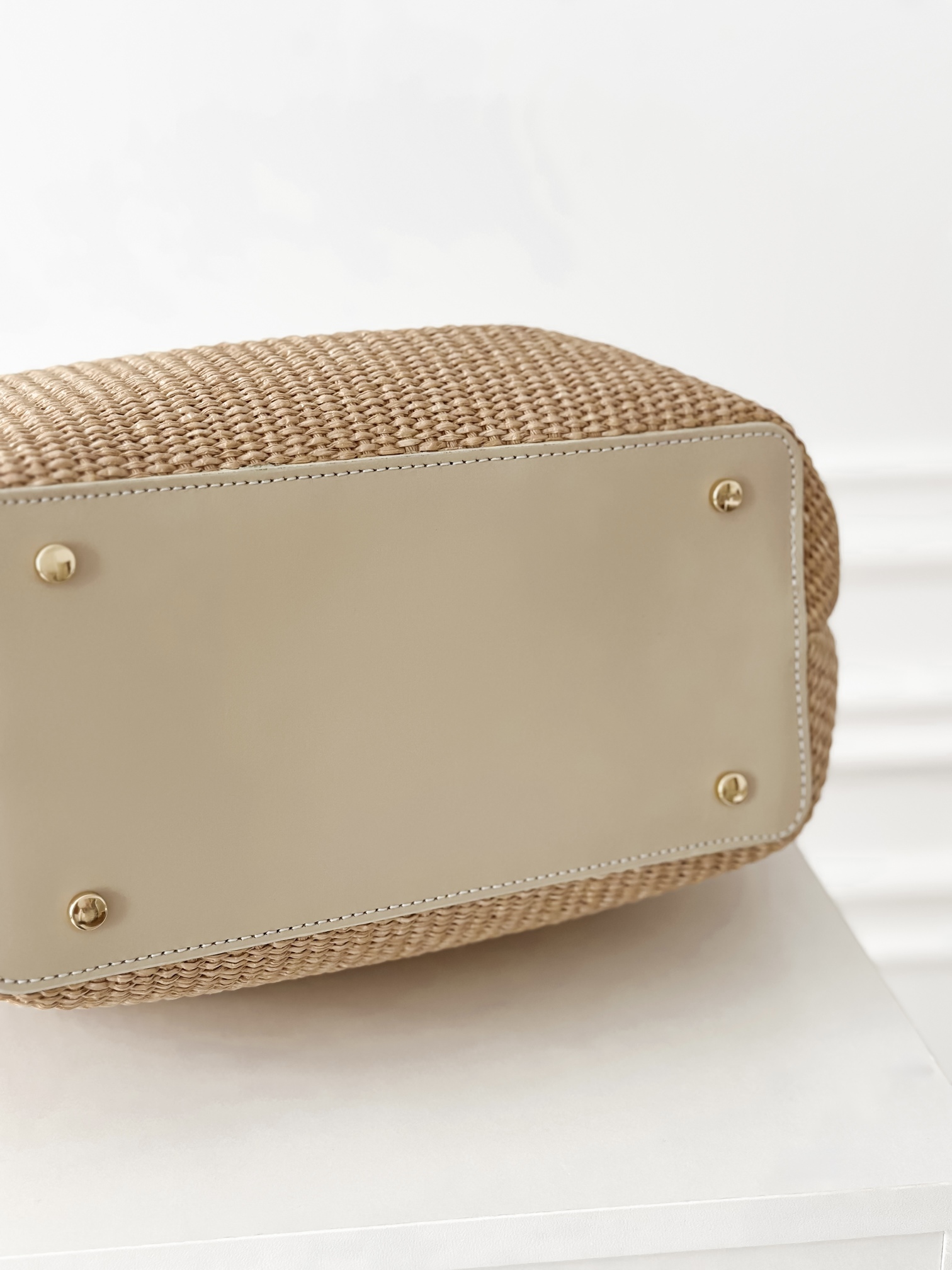 Duża, usztywniana torba wykonana z połączenia skóry naturalnej i raffii.