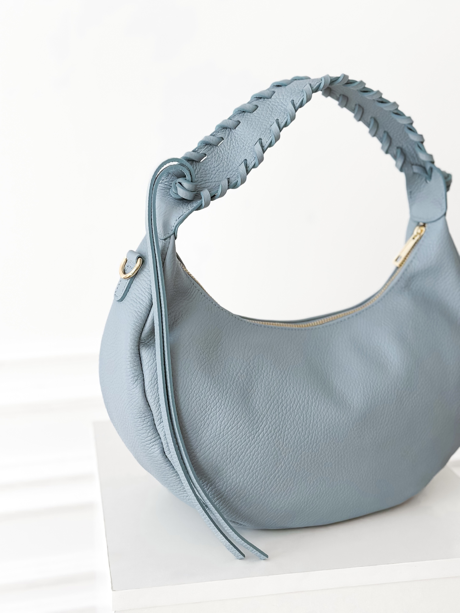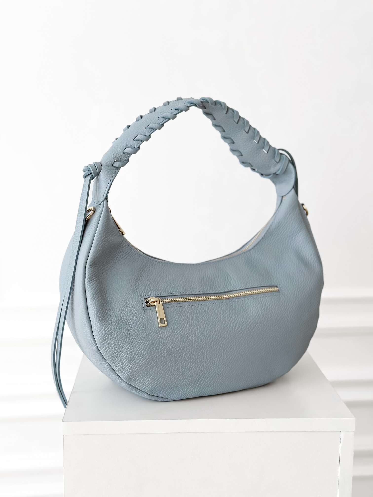 Szeroki, pleciony pasek na ramię.